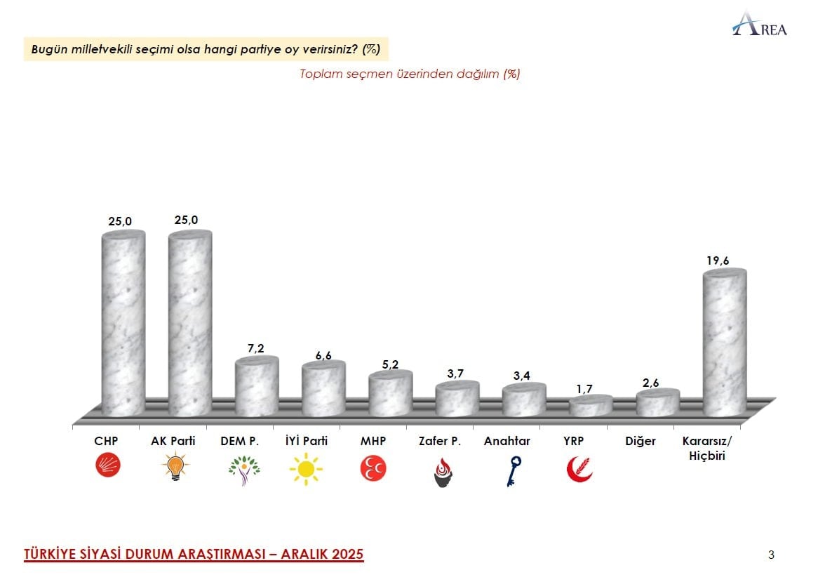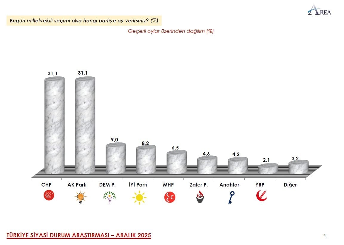 AREA Araştırma Türkiye Siyasi Gündem Araştırması- Aralık 2025 anketini kamuoyu ile paylaştı.18-23 Aralık tarihleri arasında 26 ilde 2 bin kişiyle CATI (Bilgisayar Destekli Telefonda Anket) yöntemiyle yapılan anketin güven aralığı yüzde 95 olarak belirlenirken; hata payı +- yüzde 2,19 olarak hesaplandı.