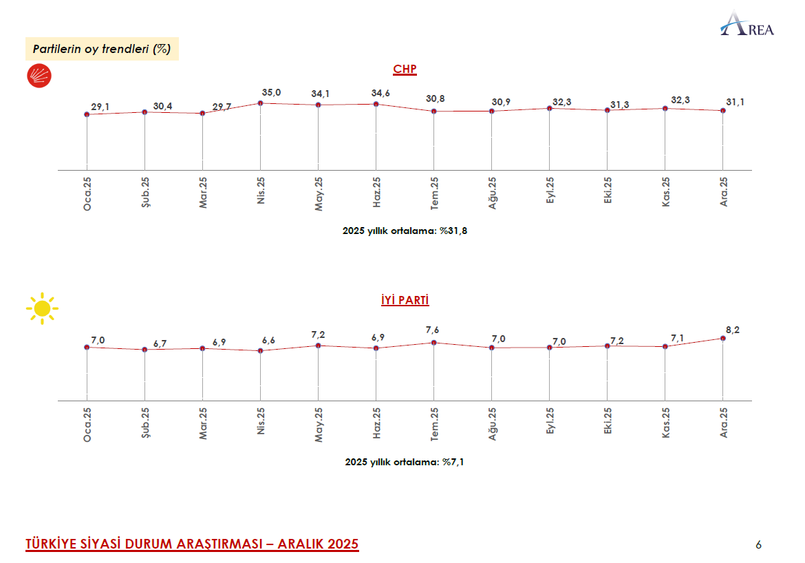 Aralık ayı anketinde ise bu oran yüzde 31,1 olarak hesaplandı. CHP’nin 2025 yılı ortalaması ise yüzde 31,8 seviyesinde ölçüldü.