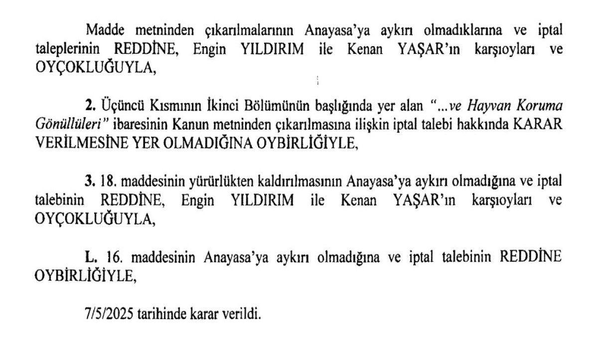 “1. Mahkememiz çoğunluğu tarafından; 7527 sayılı Kanunun 4. maddesiyle 5199 sayılı Hayvanları Koruma Kanununun 6. maddesinin; birinci fıkrasında yer alan “… 3285 sayılı Hayvan Sağlığı Zabıtası Kanununda öngörülen durumlar dışında…” ibaresinin ‘…kanuni istisnalar hariç…” şeklinde değiştirilmesinin; Kanunun 5. maddesiyle 5199 sayılı Kanunun 13. maddesine eklenen ikinci fıkranın ve 13. maddenin dördüncü fıkrasının ikinci cümlesinde yer alan “Öldürme esas ve usulleri…” ibaresinin “Öldürme ve ölanazi işlemine ilişkin esas ve usuller…” şeklinde değiştirilmesinin; 6. maddesiyle 5199 sayılı Kanun’un 14. maddesinin; Birinci fıkrasının (h) bendinde yer alan “Tibbî… ” ibaresinin “Kanunî ve tıbbî…” şeklinde değiştirilmesinde bulunan “Kanuni…” ibaresinin; 7. maddesiyle 5199 sayılı Kanun’un 16. maddesinin birinci fıkrasının; değiştirilen (b) bendinde yer alan; “…her türlü önlemi almak, ” ibaresinin, Anayasa’ya aykırı olmadığına ve söz konusu kurallara yönelik iptal talebinin reddine karar verilmiştir.”