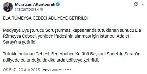 Medyaya Uyuşturucu Soruşturması kapsamında tutuklanan sunucu Ela Rümeysa Cebeci, yeniden ifadesinin alınması için İstanbul Adalet Sarayı’na getirildi.