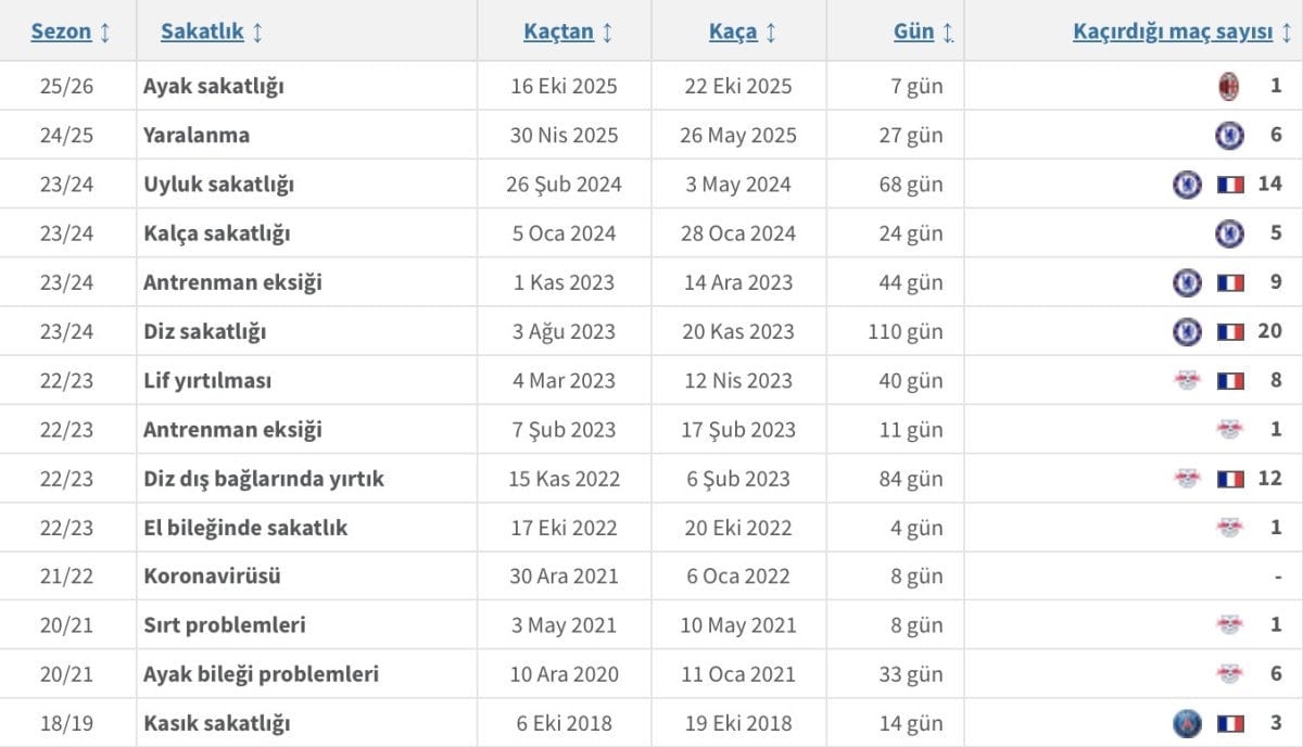 AC Milan formasıyla kariyerine devam eden Nkunku, Serie A’da istikrar yakalamayı hedefliyor. Sakatlık geçmişiyle ilgili detaylar için aşağıdaki görseli inceleyebilirsiniz.